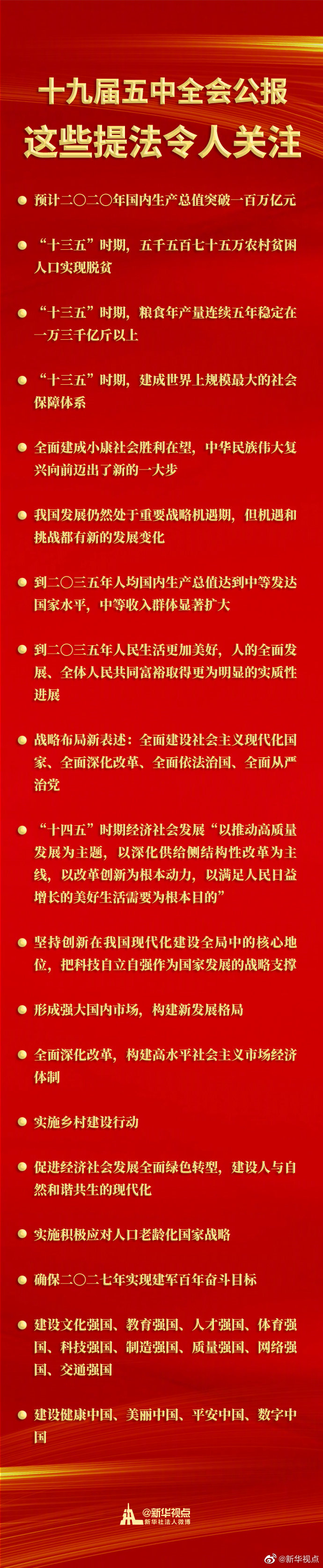 全會提出“堅(jiān)持創(chuàng)新在我國現(xiàn)代化建設(shè)全局中的核心地位”“加快發(fā)展現(xiàn)代產(chǎn)業(yè)體系,推動經(jīng)濟(jì)體系優(yōu)化升級”“形成強(qiáng)大國內(nèi)市場,構(gòu)建新發(fā)展格局”“全面深化改革,構(gòu)建高水平社會主義市場經(jīng)濟(jì)體制”等12個(gè)方面的部署。