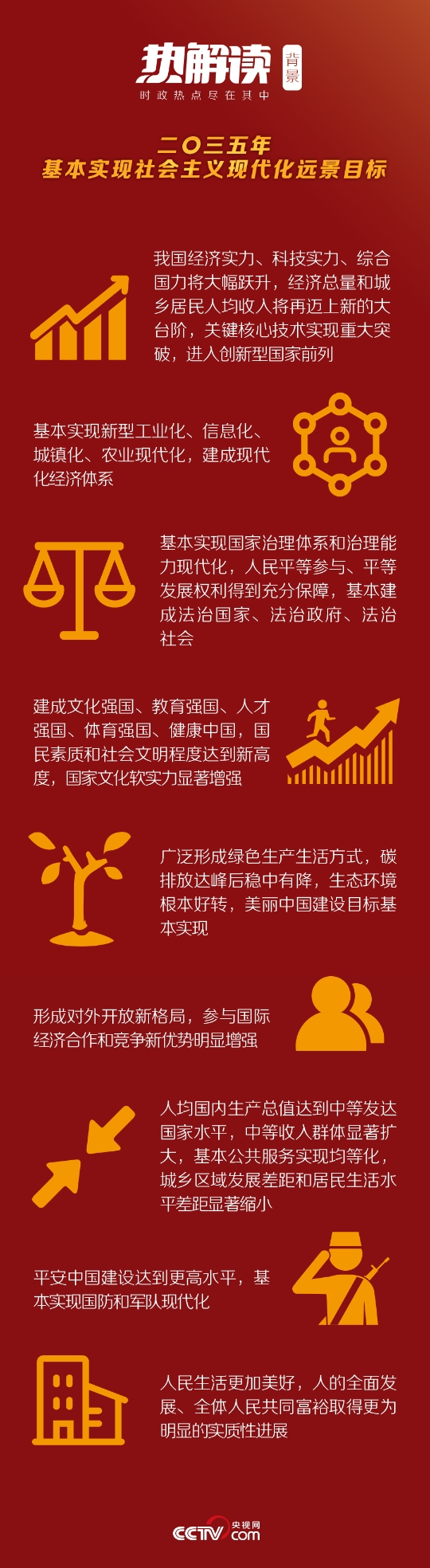 展望2035年遠(yuǎn)景目標(biāo),奮進(jìn)中國前景可期。全黨全國各族人民凝心聚力,開啟全面建設(shè)社會主義現(xiàn)代化國家新征程。 奮進(jìn)中國的新征程中,有新的目標(biāo)、新的視角、新的指標(biāo)。 “全面建設(shè)社會主義現(xiàn)代化國家”體系更清晰、路徑更具體、指標(biāo)更明確: ——“關(guān)鍵核心技術(shù)實現(xiàn)重大突破,進(jìn)入創(chuàng)新型國家前列”; ——“基本實現(xiàn)新型工業(yè)化、信息化、城鎮(zhèn)化、農(nóng)業(yè)現(xiàn)代化,建成現(xiàn)代化經(jīng)濟體系”; ——“國民素質(zhì)和社會文明程度達(dá)到新高度,國家文化軟實力顯著增強”; ——“人均國內(nèi)生產(chǎn)總值達(dá)到中等發(fā)達(dá)國家水平,中等收入群體顯著擴大”; ——“生態(tài)環(huán)境根本好轉(zhuǎn),美麗中國建設(shè)目標(biāo)基本實現(xiàn)”; …… 奮進(jìn)中國的新征程中,有強有力的保障。 堅持黨的全面領(lǐng)導(dǎo),全部事業(yè)都建立在此之上。 堅持和完善黨領(lǐng)導(dǎo)經(jīng)濟社會發(fā)展的體制機制,為實現(xiàn)高質(zhì)量發(fā)展提供根本保證。 堅持和完善中國特色社會主義制度,這是當(dāng)代中國發(fā)展進(jìn)步的根本制度保障。 新時期,構(gòu)建更加堅強的政治保障、體制保障、制度保障,同心同德,頑強奮斗,我們必將奪取全面建設(shè)社會主義現(xiàn)代化國家新勝利!擊鼓催征,再出發(fā)! |