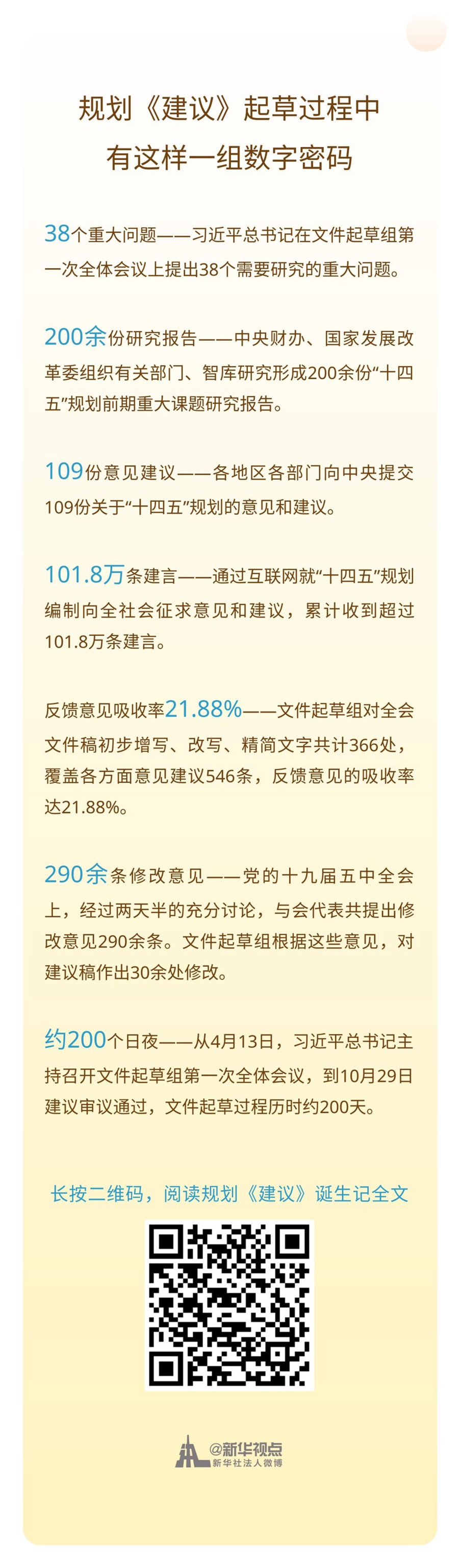 新華社4日播發(fā)了規(guī)劃《建議》誕生記,這篇萬字長文中,披露了規(guī)劃《建議》起草過程中的一組數(shù)字密碼。