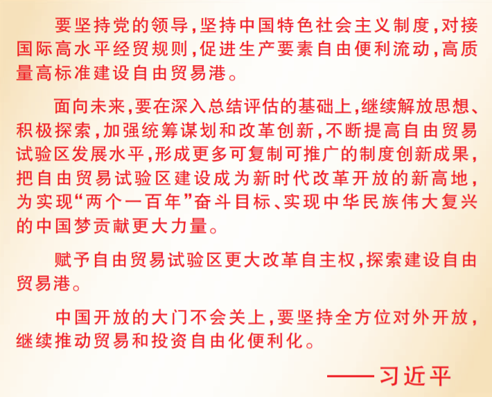 “建設(shè)自由貿(mào)易試驗(yàn)區(qū)是黨中央在新時(shí)代推進(jìn)改革開放的一項(xiàng)戰(zhàn)略舉措,在我國改革開放進(jìn)程中具有里程碑意義。”