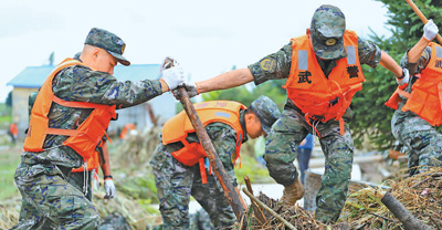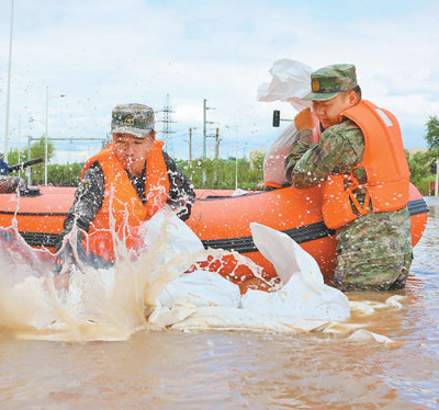 8月5日,黑龍江省哈爾濱市道外區(qū)人武部民兵應(yīng)急分隊在團(tuán)結(jié)鎮(zhèn)勤勞村展開救援。 呂衍海攝(新華社發(fā))