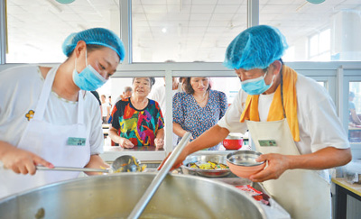 8月6日,河北省獻(xiàn)縣段村鎮(zhèn)段村中學(xué)安置點,群眾在排隊取餐。 本報記者 陳 斌攝