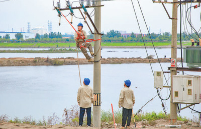 日前,國網(wǎng)北京石景山供電公司搶修人員在北京市房山區(qū)羊頭崗村搶修受損電力線路。 李 強攝