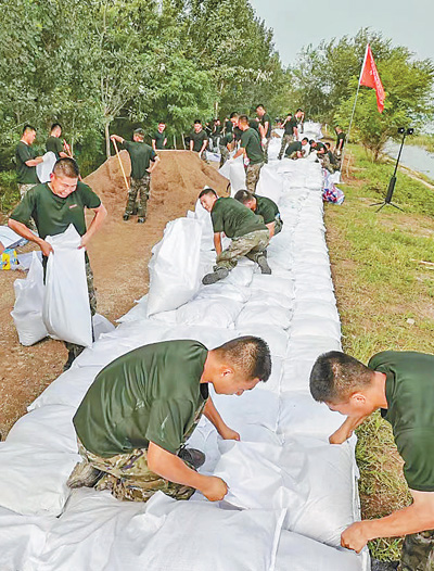 日前,天津市靜海區(qū)臺頭鎮(zhèn)大清河南岸,武警天津總隊官兵在加固堤壩。 武警天津總隊供圖
