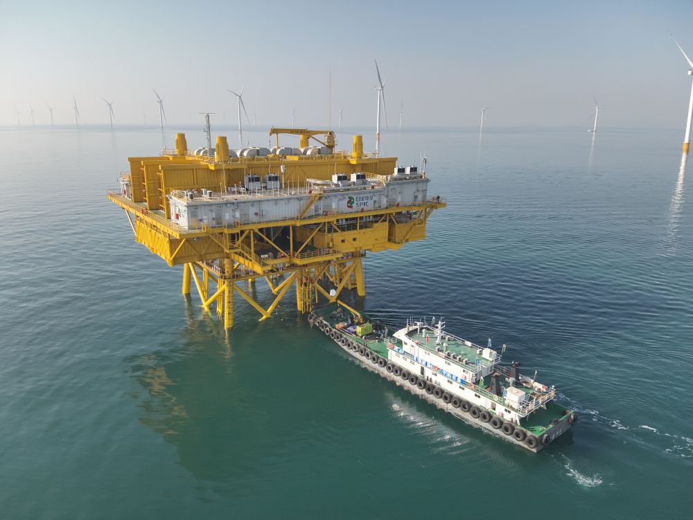 從場站所處的山東省乳山市出發(fā),乘船兩個多小時,進(jìn)入離岸20余公里的山東半島南U1場址海上風(fēng)電項(xiàng)目。迎著落日,船??吭陧?xiàng)目的“心臟”——海上升壓站。這是一座穩(wěn)立海上的鋼鐵建筑,項(xiàng)目一期53臺風(fēng)機(jī)發(fā)出的電能全部在此匯集、升壓,再通過地下電纜送入陸上的千家萬戶。