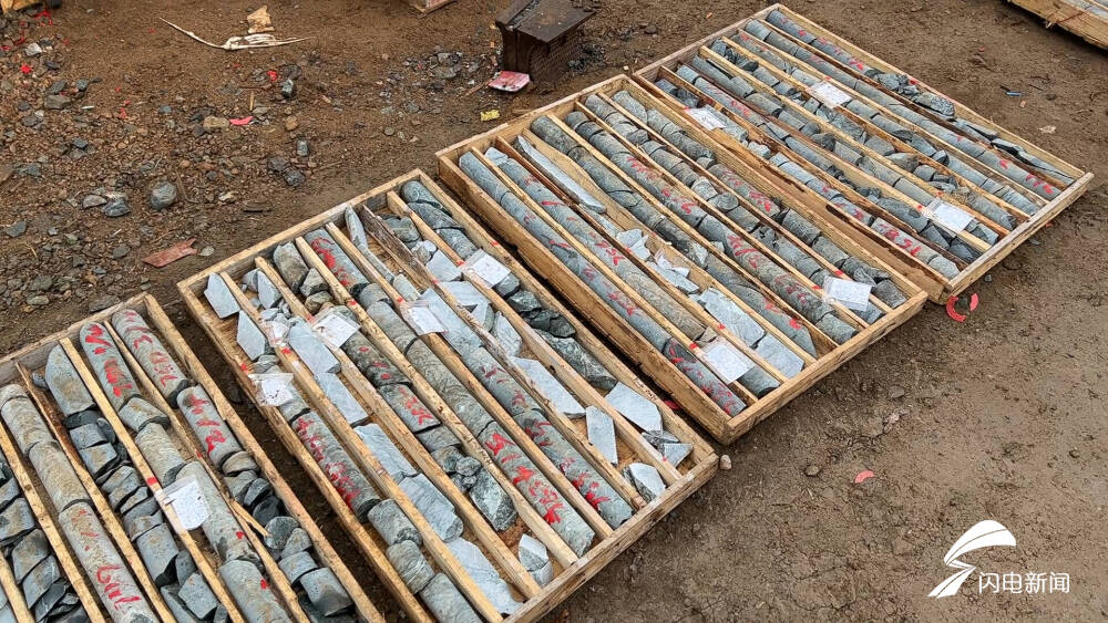 坐著輪胎不斷打滑的越野車,經(jīng)過幾次泥地坡起,記者跟隨地質(zhì)人員終于來到探礦的施工現(xiàn)場。首先映入眼簾的是平鋪在地上的木盒,數(shù)量很多,里面裝著各類圓柱形礦石樣本,仔細觀察后發(fā)現(xiàn),部分石塊中竟然還閃爍著淡淡金色。當記者問起這些亮閃閃的金色是不是傳說中的“金礦”時,山東省第一地質(zhì)礦產(chǎn)勘查院項目經(jīng)理李大兜表示,這些石塊需要地質(zhì)人員仔細辨認,才能最終給礦石定性,確認石塊里是否富含金礦。