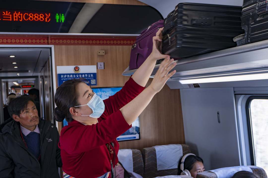 記者跟隨乘務(wù)員,體驗他們一天的工作。 隨著春節(jié)及藏歷新年假期進入尾聲,西藏春運迎來返程高峰。2月17日,記者跟隨來到了青藏鐵路拉薩至日喀則的列車上,通列車員一道感受春運高峰的忙碌。 一趟車上,列車員格外忙碌。發(fā)車前,青藏鐵路動車組拉林段四組班長列車員李丹站在車門口,對上車的旅客反復叮囑:“上車注意腳下安全!”;車門關(guān)閉后,她又忙不停蹄地在車廂內(nèi)來回穿梭,幫旅客檢查行李,“我?guī)湍硪幌履男欣?!”;列車啟動后,李丹又抓緊用給旅客提示“列車內(nèi)禁止吸煙!”