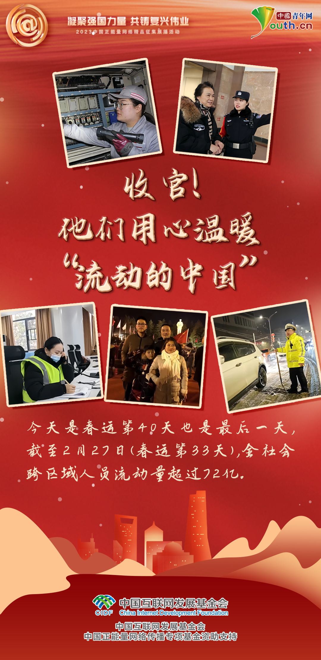 凝聚強(qiáng)國力量,共鑄復(fù)興偉業(yè)。今天,是2024春運(yùn)的最后一天。40天的旅程里感動無處不在。有人堅(jiān)守一線,用一聲您好、一次攙扶詮釋使命擔(dān)當(dāng)。有人雪中送炭,用一杯熱水、一抹微笑溫暖漫長旅途。微光匯聚正能量,春運(yùn)路上,感謝有你們。(記者 劉尚君 見習(xí)記者 馮云慧 實(shí)習(xí)生 韓旭陽)