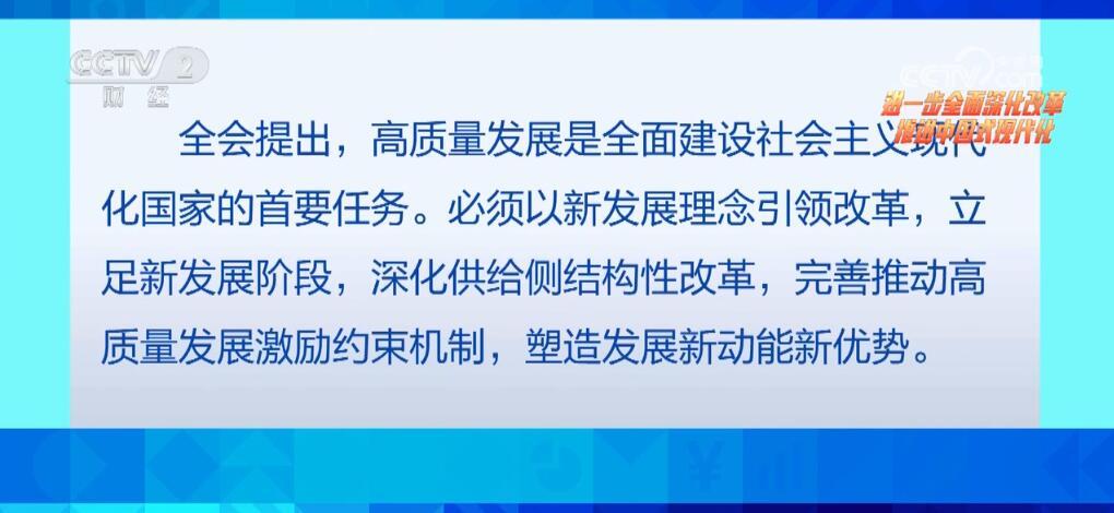 全會提出,高質(zhì)量發(fā)展是全面建設(shè)社會主義現(xiàn)代化國家的首要任務(wù)。必須以新發(fā)展理念引領(lǐng)改革,立足新發(fā)展階段,深化供給側(cè)結(jié)構(gòu)性改革,完善推動高質(zhì)量發(fā)展激勵約束機制,塑造發(fā)展新動能新優(yōu)勢。要健全因地制宜發(fā)展新質(zhì)生產(chǎn)力體制機制,健全促進實體經(jīng)濟和數(shù)字經(jīng)濟深度融合制度,完善發(fā)展服務(wù)業(yè)體制機制,健全現(xiàn)代化基礎(chǔ)設(shè)施建設(shè)體制機制,健全提升產(chǎn)業(yè)鏈供應(yīng)鏈韌性和安全水平制度。