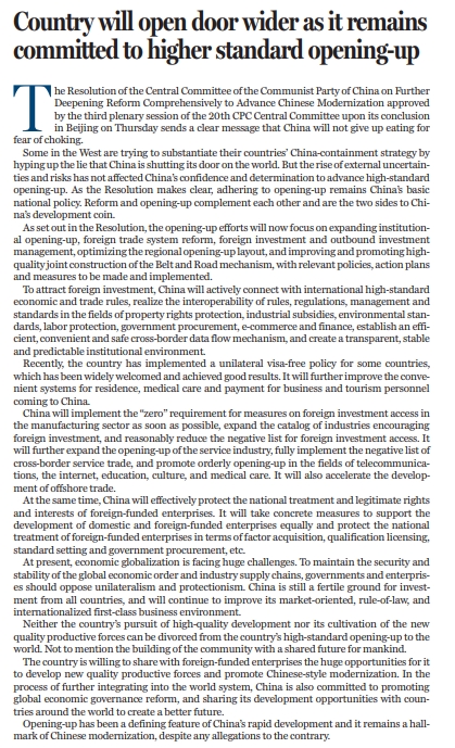 一段時(shí)間以來(lái),一些西方勢(shì)力熱衷于炒作中國(guó)要對(duì)世界“關(guān)上大門(mén)”,借這種謊言來(lái)推行其遏制中國(guó)的戰(zhàn)略。但不確定性以及風(fēng)險(xiǎn)的增多,并不能動(dòng)搖中國(guó)繼續(xù)深化改革、擴(kuò)大開(kāi)放的堅(jiān)定決心和信心?!稕Q定》明確指出,必須堅(jiān)持對(duì)外開(kāi)放基本國(guó)策。 改革與開(kāi)放相輔相成、相互促進(jìn),也是中國(guó)發(fā)展的兩大主題。 《決定》指出,完善高水平對(duì)外開(kāi)放體制機(jī)制將聚焦于穩(wěn)步擴(kuò)大制度型開(kāi)放、深化外貿(mào)體制改革、深化外商投資和對(duì)外投資管理體制改革、優(yōu)化區(qū)域開(kāi)放布局、完善推進(jìn)高質(zhì)量共建“一帶一路”機(jī)制幾大方面。預(yù)計(jì)相關(guān)政策、行動(dòng)方案以及措施未來(lái)也將持續(xù)出臺(tái)實(shí)施。 為進(jìn)一步吸引外資,中國(guó)將主動(dòng)對(duì)接國(guó)際高標(biāo)準(zhǔn)經(jīng)貿(mào)規(guī)則,在產(chǎn)權(quán)保護(hù)、產(chǎn)業(yè)補(bǔ)貼、環(huán)境標(biāo)準(zhǔn)、勞動(dòng)保護(hù)、政府采購(gòu)、電子商務(wù)、金融領(lǐng)域等實(shí)現(xiàn)規(guī)則、規(guī)制、管理、標(biāo)準(zhǔn)相通相容,建立高效便利安全的數(shù)據(jù)跨境流動(dòng)機(jī)制,打造透明、穩(wěn)定、可預(yù)期的制度環(huán)境。 近期,中國(guó)對(duì)多國(guó)實(shí)施的單方面免簽政策受到了廣泛的歡迎,也收獲了積極的成果。未來(lái),中國(guó)還將進(jìn)一步完善來(lái)華經(jīng)商旅游人員居住、醫(yī)療、支付等便利制度。 中國(guó)將盡快落實(shí)制造業(yè)領(lǐng)域外資準(zhǔn)入限制措施“清零”要求,擴(kuò)大鼓勵(lì)外商投資產(chǎn)業(yè)目錄,合理縮減外資準(zhǔn)入負(fù)面清單。擴(kuò)大服務(wù)業(yè)開(kāi)放,全面實(shí)施跨境服務(wù)貿(mào)易負(fù)面清單,推動(dòng)電信、互聯(lián)網(wǎng)、教育、文化、醫(yī)療等領(lǐng)域有序擴(kuò)大開(kāi)放。加快推進(jìn)離岸貿(mào)易發(fā)展。 與此同時(shí),中國(guó)還將切實(shí)保障外資企業(yè)國(guó)民待遇和合法權(quán)益,一視同仁支持內(nèi)外資企業(yè)發(fā)展,保障外資企業(yè)在要素獲取、資質(zhì)許可、標(biāo)準(zhǔn)制定、政府采購(gòu)等方面的國(guó)民待遇。 當(dāng)前,經(jīng)濟(jì)全球化面臨巨大挑戰(zhàn),反對(duì)單邊主義、保護(hù)主義,維護(hù)全球經(jīng)濟(jì)秩序和產(chǎn)業(yè)鏈、供應(yīng)鏈的安全穩(wěn)定,是各國(guó)政府和企業(yè)共同的責(zé)任。中國(guó)依然是各國(guó)投資的沃土,也將不斷完善市場(chǎng)化、法治化、國(guó)際化一流營(yíng)商環(huán)境。 中國(guó)的對(duì)外開(kāi)放,對(duì)自身,對(duì)全球都意義重大。無(wú)論是實(shí)現(xiàn)自身的高質(zhì)量發(fā)展,還是培育新質(zhì)生產(chǎn)力,都離不開(kāi)高水平的對(duì)外開(kāi)放,對(duì)構(gòu)建人類(lèi)命運(yùn)共同體也是如此。 中國(guó)愿同廣大外資企業(yè)分享中國(guó)發(fā)展新質(zhì)生產(chǎn)力、推進(jìn)中國(guó)式現(xiàn)代化蘊(yùn)藏的巨大機(jī)遇。在進(jìn)一步融入世界體系的進(jìn)程中,中國(guó)也致力于推動(dòng)實(shí)現(xiàn)全球經(jīng)濟(jì)治理改革,與世界各國(guó)共享發(fā)展機(jī)遇,共創(chuàng)美好未來(lái)。 對(duì)外開(kāi)放是中國(guó)高速發(fā)展的決定性特征,也是中國(guó)式現(xiàn)代化的鮮明標(biāo)識(shí)。中國(guó)開(kāi)放的大門(mén)只會(huì)越來(lái)越大,任何對(duì)中國(guó)對(duì)外開(kāi)放的質(zhì)疑終將站不住腳,而中國(guó)推動(dòng)更高水平開(kāi)放、建設(shè)開(kāi)放型世界經(jīng)濟(jì)和構(gòu)建人類(lèi)命運(yùn)共同體的步伐也一定不會(huì)停滯。