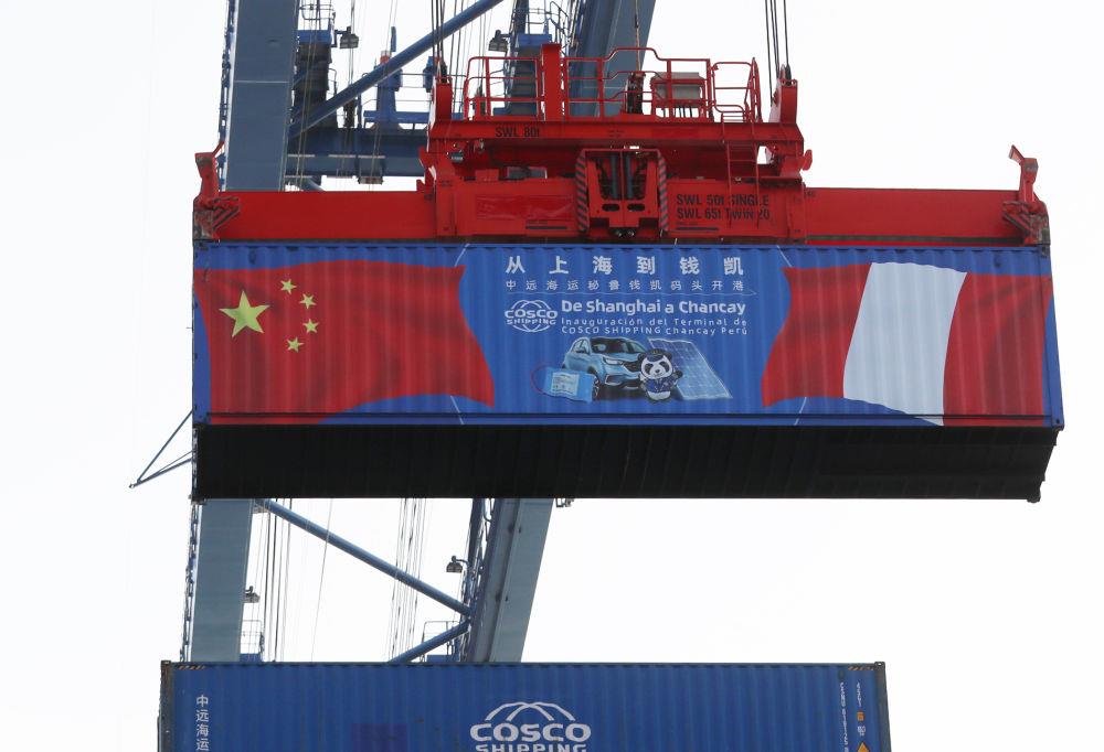 △2024年11月14日,在秘魯首都利馬以北的錢凱港,岸邊智能化設備吊裝集裝箱。