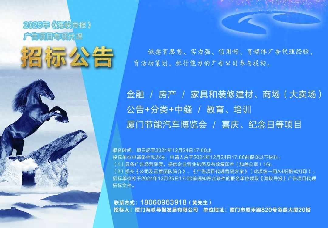 招標(biāo)單位將于2024年12月25日17:00前通知符合條件的報(bào)名單位領(lǐng)取《海峽導(dǎo)報(bào)》廣告項(xiàng)目代理招標(biāo)文件。