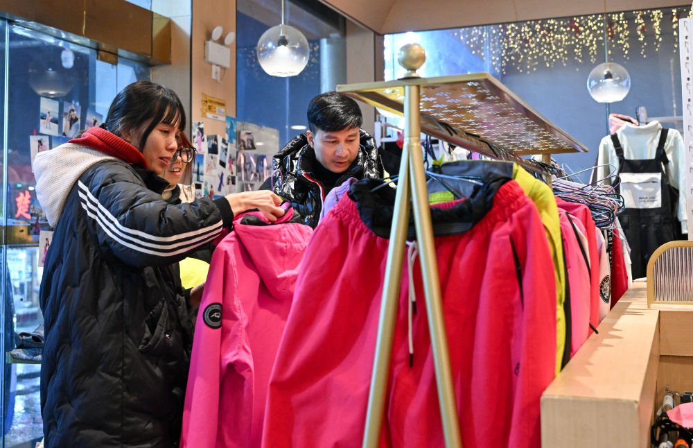 2025年1月23日,游客在湖北神農(nóng)架林區(qū)木魚鎮(zhèn)街邊一家店鋪挑選雪具雪服。自然天成的地理環(huán)境造就豐富的冰雪資源,也給當(dāng)?shù)剡\(yùn)動(dòng)裝備銷售、租賃行業(yè)帶來了商機(jī)。