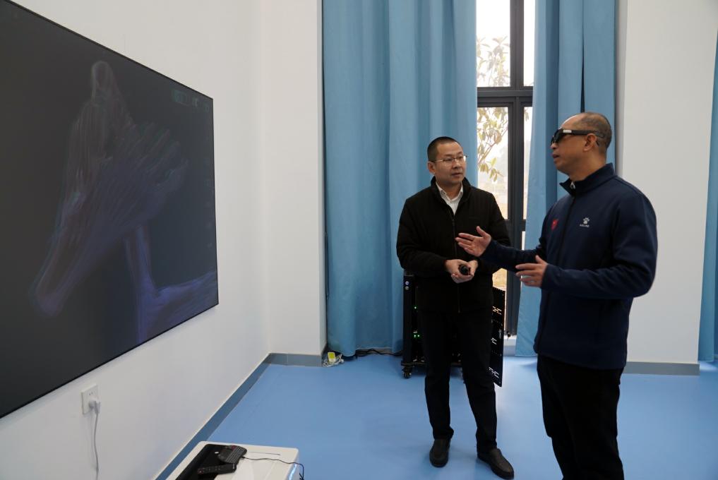 2月17日,在廣西體育高等專科學(xué)校,韋軍與運(yùn)動(dòng)健康學(xué)院的老師交流,了解3D模擬運(yùn)動(dòng)解剖模型如何助力教學(xué)。新華社記者 陳露緣 攝