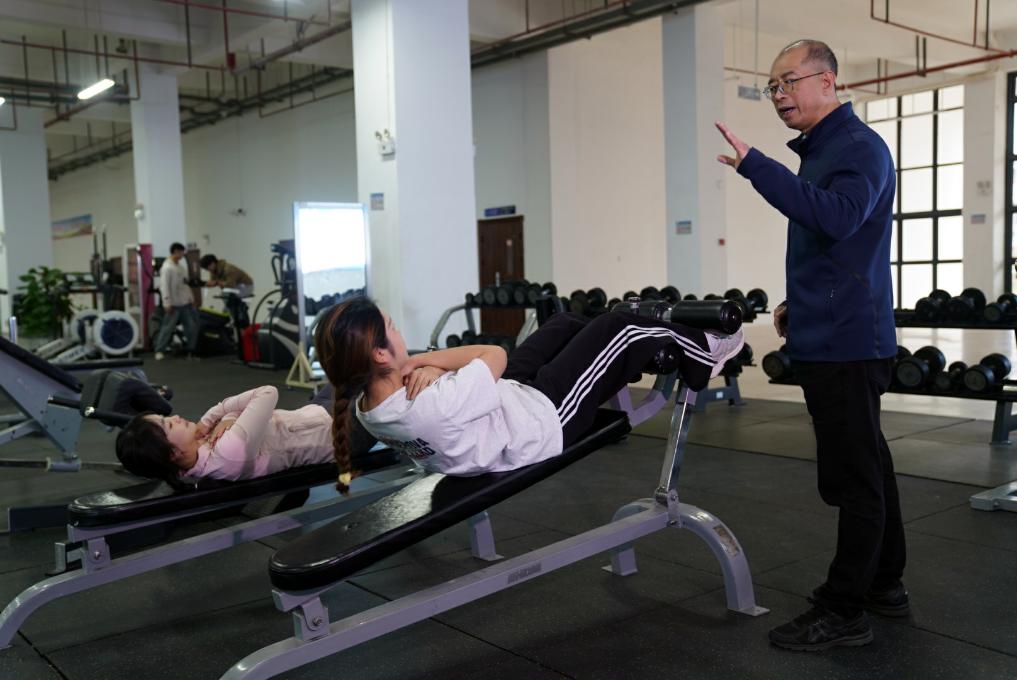 2月17日,在廣西體育高等??茖W(xué)校,韋軍在指導(dǎo)學(xué)生進(jìn)行體育鍛煉。新華社記者 陳露緣 攝