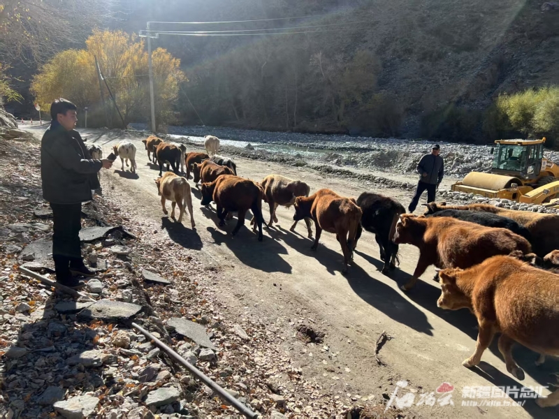 2月24日,和靜縣克爾古提鄉(xiāng)那音特村牧民李加拉,將自己家的53頭牛從冬牧場轉(zhuǎn)場至春草場。通訊員 烏努爾攝
