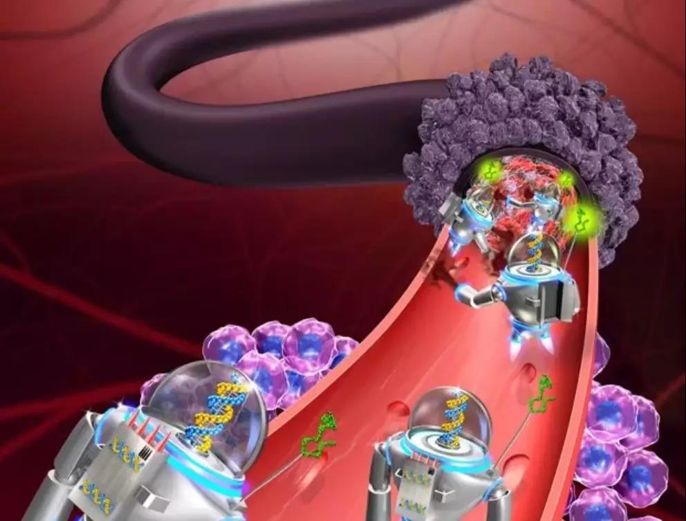 納米機器人或許將開啟一場醫(yī)療革命??茖W(xué)家設(shè)想,納米機器人能夠在人體血管中巡航,精準(zhǔn)清除血栓、修復(fù)癌癥細(xì)胞,就像快遞小哥一樣定點遞送藥物,實現(xiàn)“無創(chuàng)手術(shù)”。圖為用于腫瘤治療的智能型DNA納米機器人示意圖。國家納米科學(xué)中心供圖