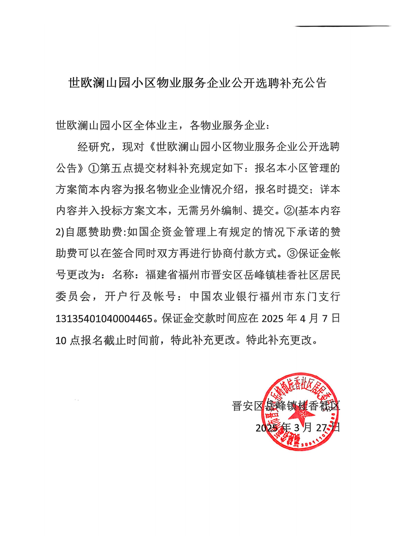 世歐瀾山園小區(qū)物業(yè)服務(wù)企業(yè)公開(kāi)選聘補(bǔ)充公告