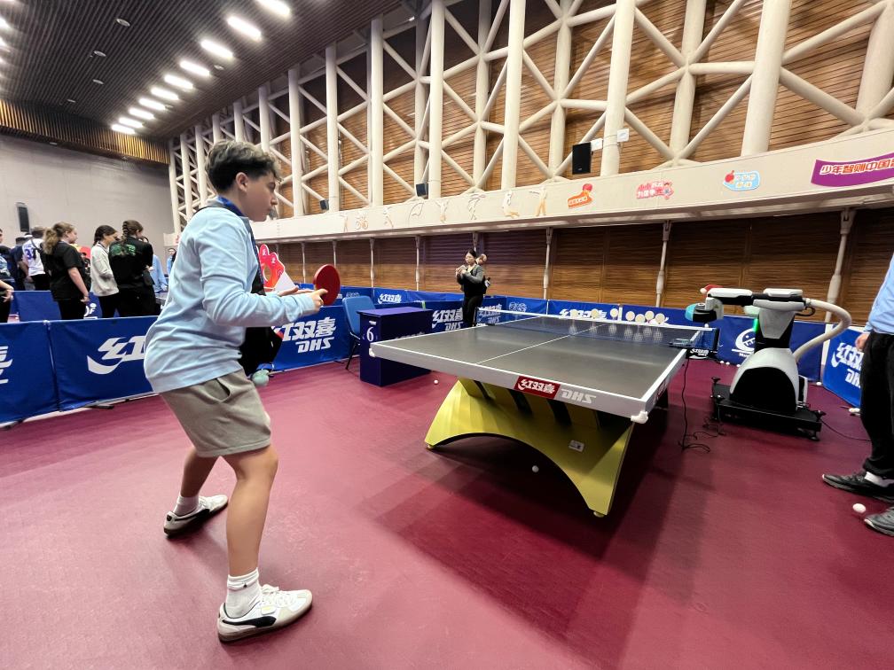 4月12日,美國青少年在上海國際乒聯(lián)博物館和中國乒乓球博物館的乒乓球發(fā)球機(jī)器人前體驗(yàn)接球。新華社記者有之炘攝 二樓體驗(yàn)區(qū)的乒乓球發(fā)球機(jī)器人前,學(xué)生們輪番挑戰(zhàn)。曾在美國全國U14乒乓球比賽中拿下過第7名的瑞恩·特洛伊·李揮拍上陣,飛快的反應(yīng)速度引發(fā)伙伴們此起彼伏的歡呼和掌聲。 普爾斯維爾高中的伊恩·斯科特·哈珀捧著體驗(yàn)紀(jì)念證書與同伴興奮合影:“相比匹克球,乒乓球節(jié)奏更快,對(duì)反應(yīng)速度和擊球精度要求更高。我喜歡這里的氛圍,處處彰顯著體育的魅力!”