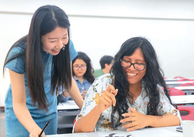 圖為在秘魯利馬,秘魯天主教大學(xué)孔子學(xué)院中文教師梁卿(左)輔導(dǎo)秘魯學(xué)生寫書法。