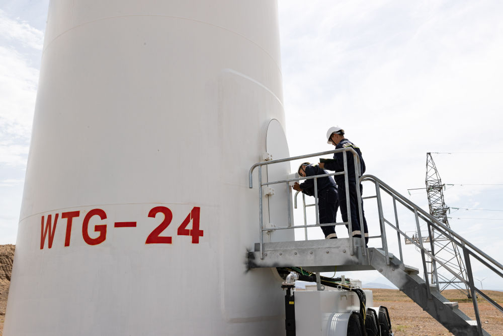 2024年6月25日,在哈薩克斯坦阿拉木圖州謝列克風(fēng)電場,工作人員準(zhǔn)備打開風(fēng)機(jī)塔筒門進(jìn)行檢查。新華社記者白雪騏攝