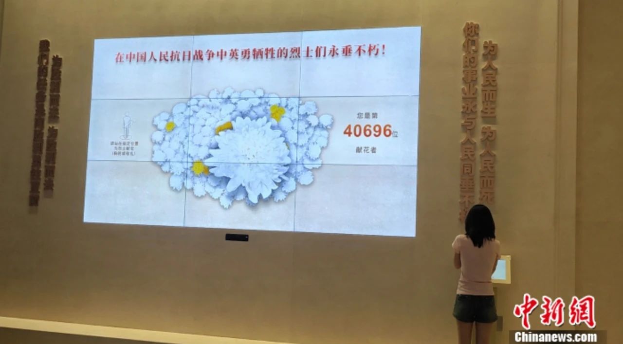 《為了民族解放與世界和平》主題展覽在中國(guó)人民抗日戰(zhàn)爭(zhēng)紀(jì)念館面向社會(huì)公眾開放。在"弘揚(yáng)偉大抗戰(zhàn)精神 深切緬懷抗戰(zhàn)英烈"專區(qū),觀眾自發(fā)獻(xiàn)花,緬懷先輩。中新社記者 杜燕 攝