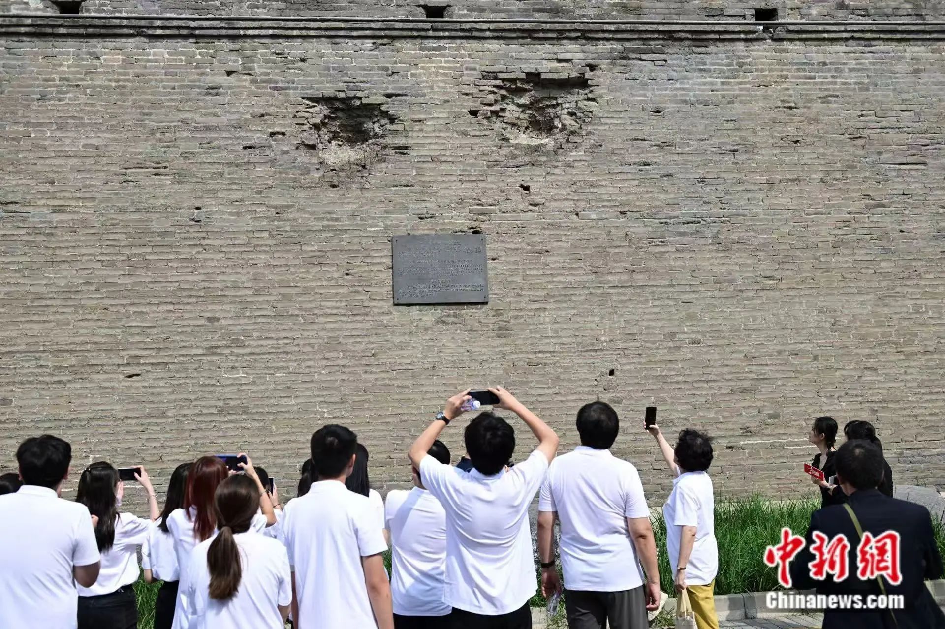 圖為在京臺(tái)港澳?年代表參觀拍攝宛平城墻體彈坑遺址。中新社記者 ??昊 攝