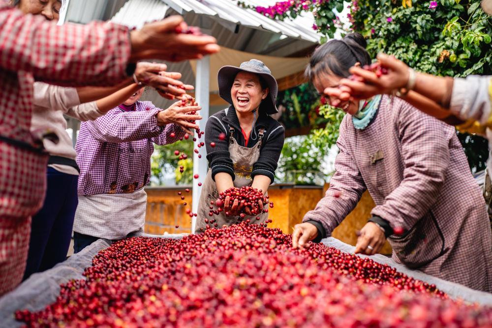 △2025年1月8日,在云南普洱思茅區(qū)一咖啡莊園,工作人員慶??Х蓉S收。