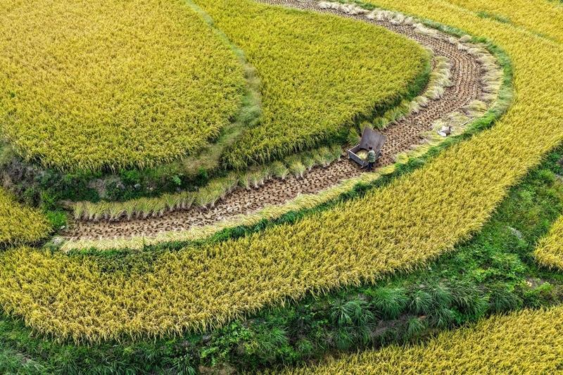 △2025年9月18日,稻農(nóng)在重慶黔江區(qū)五里鎮(zhèn)的稻田里搶收稻谷。