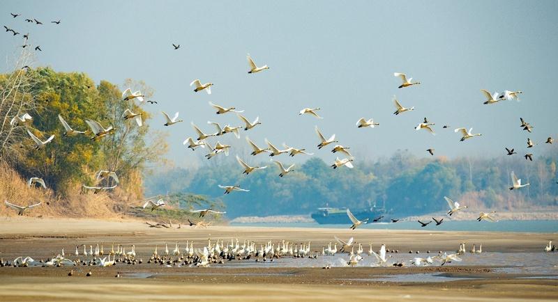 新濟(jì)洲段長(zhǎng)江沿岸,小天鵝伴隨貨物船只飛翔