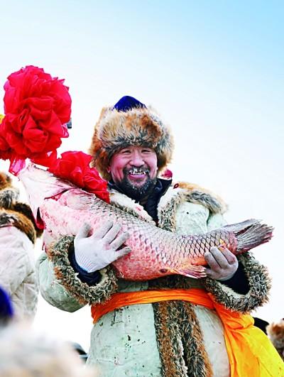 在位于新疆阿勒泰地區(qū)福??h的烏倫古湖,"漁把頭"展示冬捕的頭魚(yú)。本報(bào)記者 孫金行攝/光明圖片