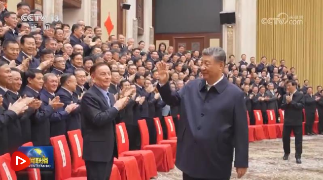 習(xí)近平等來到接見現(xiàn)場時,全場響起長時間熱烈掌聲。習(xí)近平向大家揮手致意,不時同代表親切交流,并同大家合影留念。
