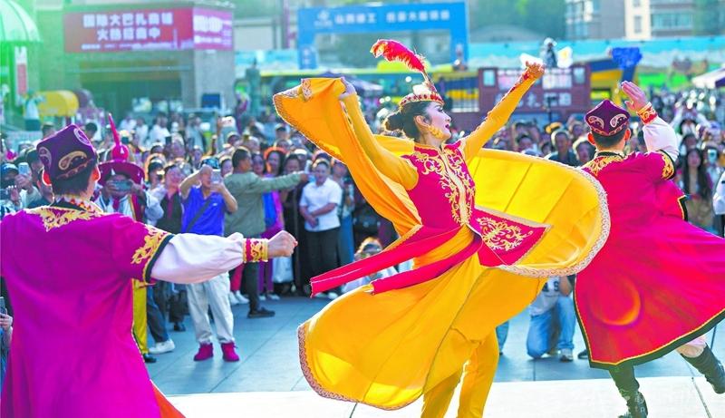 近日,游客在新疆國際大巴扎景區(qū)欣賞舞蹈。隨著秋季旅游旺季到來,各地游客紛紛來到該景區(qū)拍照打卡,享受美好生活。 □孫振嵩攝