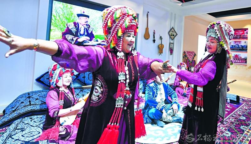近日,在慶祝新疆維吾爾自治區(qū)成立70周年——克孜勒蘇柯爾克孜自治州主題成就展展廳內(nèi),阿圖什市民間藝人深情吟唱英雄史詩《瑪納斯》。圖為民間藝人在吟唱中起舞?!跏裨?新疆日報(bào)記者湯永攝