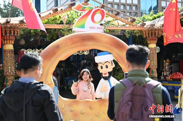 9月23日,游客在新疆烏魯木齊市大巴扎步行街打卡拍照。 中新社記者 田雨昊 攝