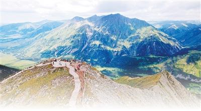 吉克普林云霄峰是阿爾泰山脈的高峰之一,山頂可俯瞰中俄哈蒙四國風光,形成"一腳踏四方"的地理奇觀。 張福新攝