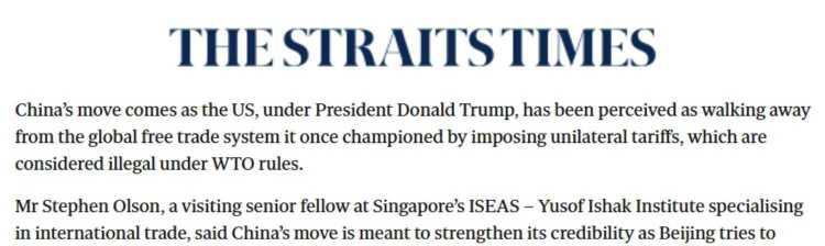 新加坡《海峽時報》報道認為,在中國作出這一決定之際,美國政府正實施單邊關(guān)稅措施,這些關(guān)稅措施違反了世界貿(mào)易組織規(guī)則,美國的做法背離了其曾倡導(dǎo)的全球自由貿(mào)易體系。新加坡尤索夫伊薩東南亞研究院訪問學者斯蒂芬·奧爾森指出,中國宣布"不搞特別"的舉措無疑將提升其國際公信力。