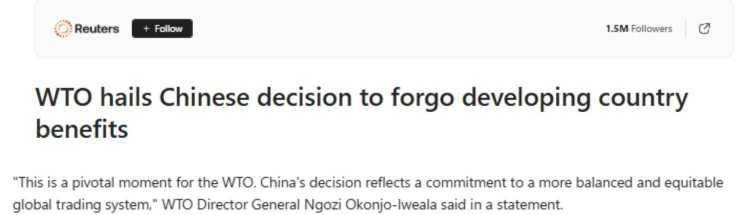 當?shù)貢r間9月23日,中方在出席第80屆聯(lián)合國大會相關(guān)活動時向全世界莊嚴宣示,中國作為負責任的發(fā)展中大國,在世貿(mào)組織當前和未來談判中將不尋求新的特殊和差別待遇。中方的這一決定,引發(fā)多家外媒關(guān)注。