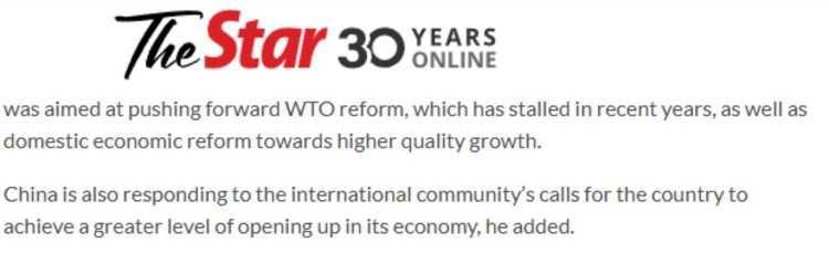 馬來西亞《星報》的報道援引業(yè)內(nèi)人士的話說,中國此舉不但是為了推動陷入停滯的世貿(mào)組織改革,也是為了以更高標準促進自身國內(nèi)經(jīng)濟轉(zhuǎn)型升級,同時,這更是對國際社會有關(guān)期待的積極回應(yīng)。