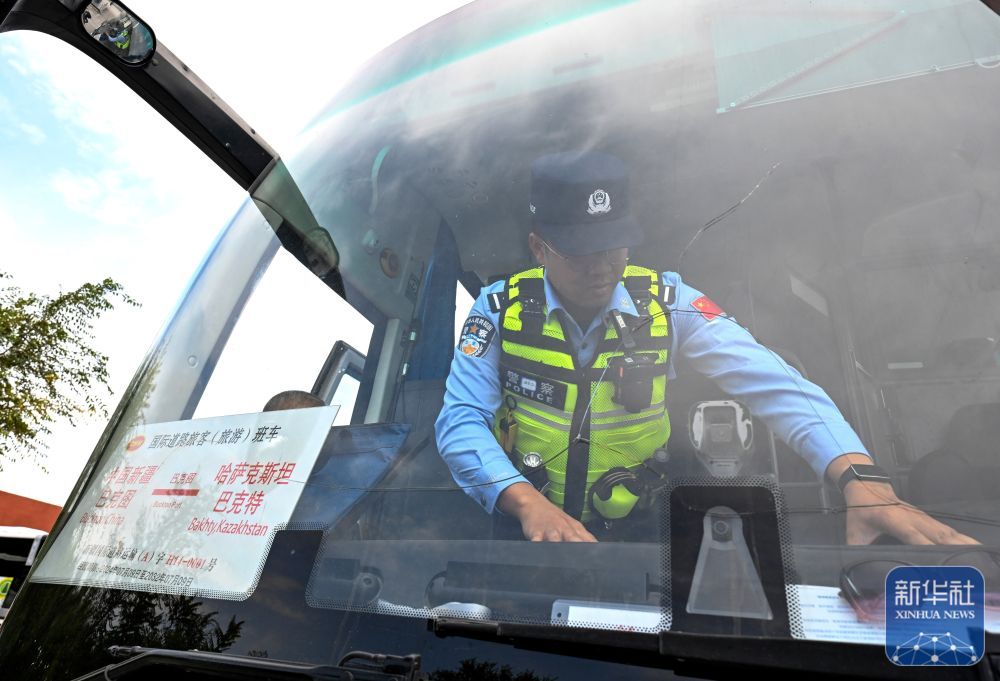 ↑9月17日,巴克圖出入境邊防檢查站的移民管理警察在巴克圖口岸查驗經(jīng)由該口岸出境前往哈薩克斯坦的客車。新華社記者 王菲 攝