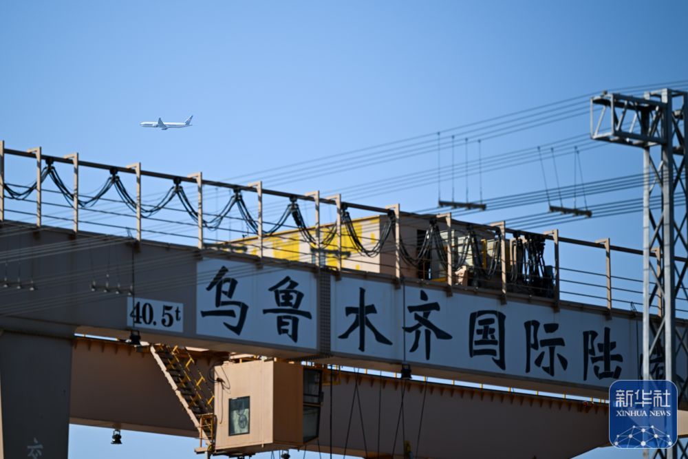↑9月15日,一架飛機(jī)從烏魯木齊國際陸港區(qū)上空飛過。新華社記者 辛悅衛(wèi) 攝