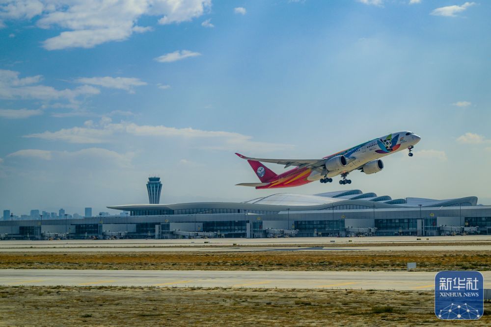 ↑9月15日,一架飛機(jī)從烏魯木齊天山國際機(jī)場起飛。新華社記者 陳朔 攝
