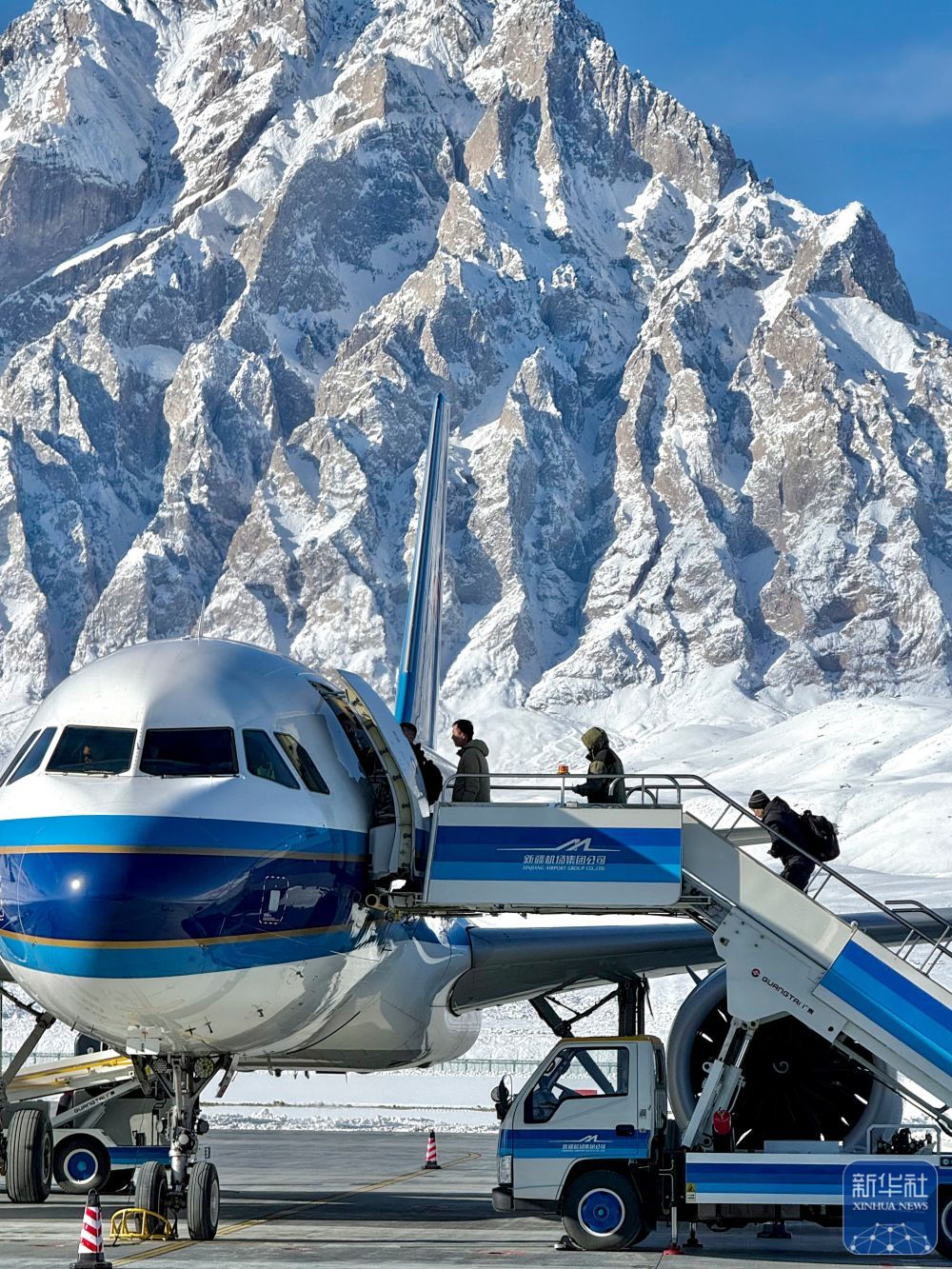 ↑1月13日,旅客在塔什庫爾干紅其拉甫機(jī)場準(zhǔn)備登機(jī)。新華社記者 陳朔 攝
