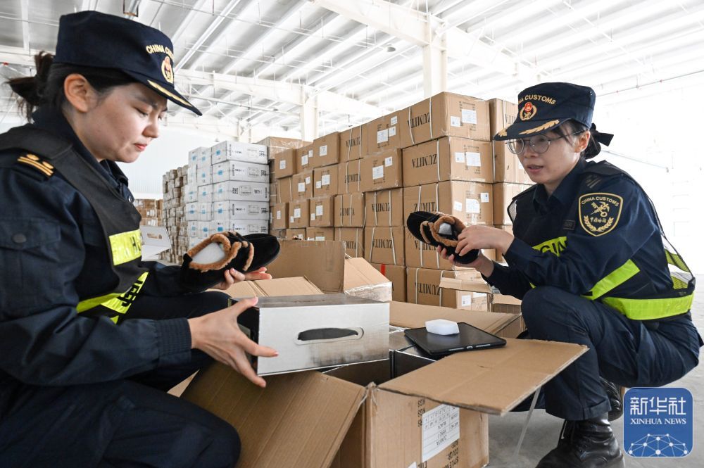 ↑9月17日,新疆塔城海關(guān)工作人員在巴克圖口岸集中查驗區(qū)檢查一批經(jīng)由該口岸運往哈薩克斯坦的鞋品。新華社記者 王菲 攝