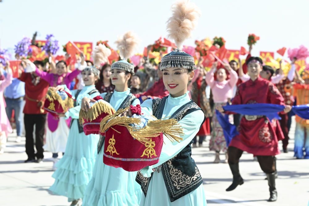 各族群眾代表身著民族服飾,載歌載舞,歡迎習(xí)近平總書記的到來,表達(dá)對總書記的衷心祝福。