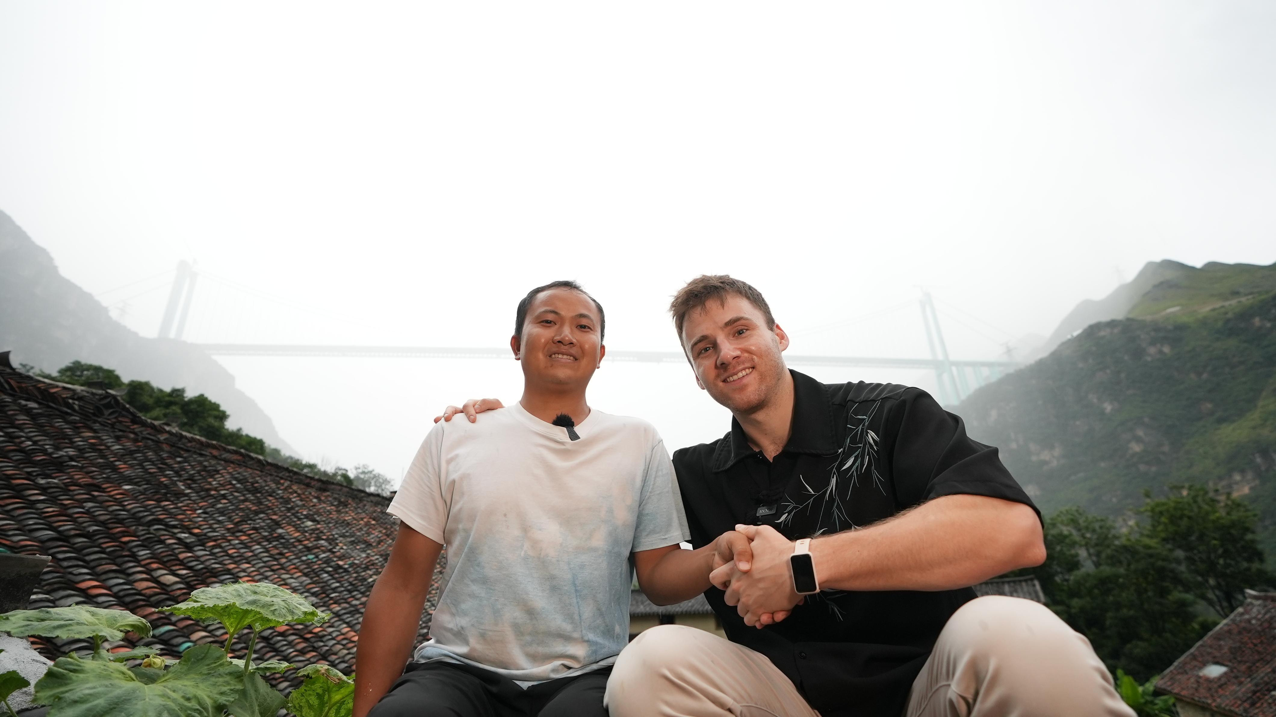 林國權(quán)(左)與柯魯瀚(右)在民宿屋頂與花江峽谷大橋合影留念。貴州日報天眼新聞記者 郭加堯 攝