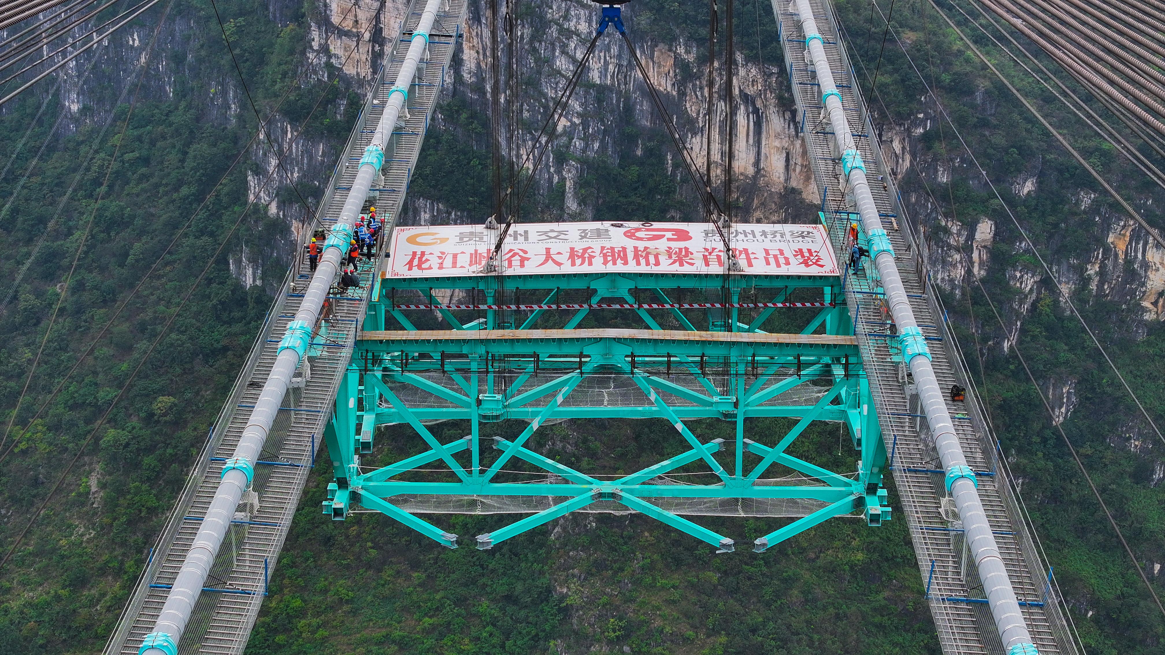 花江峽谷大橋鋼桁梁首件吊裝。貴州交投集團供圖