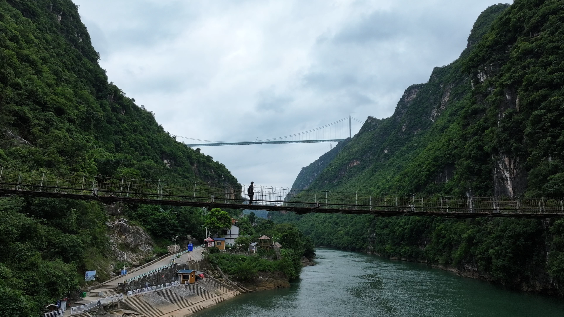 橫跨北盤江的花江鐵索橋與花江峽谷大橋。貴州日報天眼新聞記者 劉義鵬 攝