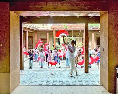 新疆庫車市龜茲小巷的非遺工坊里,暑期支教大學(xué)生正在教孩子們跳中國(guó)舞。本報(bào)記者 孫金行攝