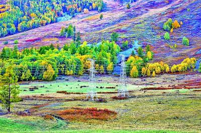 新疆阿勒泰地區(qū)喀納斯至禾木景區(qū)的110千伏高壓輸電線。努爾別克·努爾曼攝